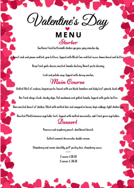 Celebrate Valentines Day with our special 3 course menu for £38.50 or 2 courses for £28.50